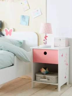 Un chevet tout en douceur et en poésie qui se place à côté du lit pour accueillir une lampe, une veilleuse et accueillir les livres. Il dispose d’un tiroir et d’une niche de rangement.