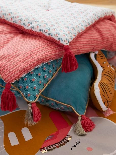 Un couvre-lit aux motifs exotiques, qui offre à la chambre un décor inspiré d’ailleurs. Pour ajouter une touche ethnique, 4 jolis pompons colorent les coins de cette couverture matelassée, prête à réchauffer les enfants en douceur.