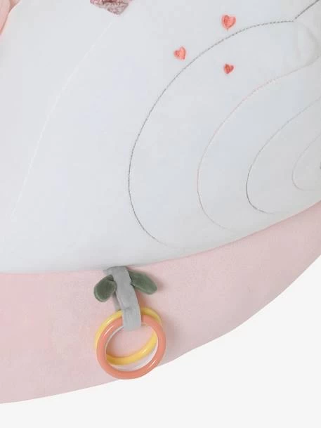 - 1 fleur vibrante, 1 coccinelle pouet-pouet, 1 lapin dans une poche attaché avec un scratch, 1 anneau transparent avec billes colorées, 3 anneaux en plastique, 1 miroir, des rubans…