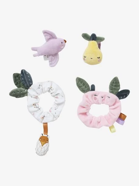- 1 hochet pied rose avec yeux, joues brodées et feuilles en volume + 1 hochet pied imprimé fleur avec cigale à grelot et feuilles en volume