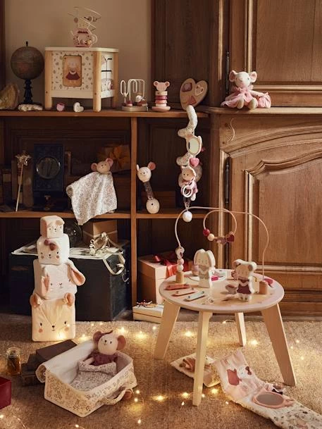 - 3 jouets suspendus par des liens : – 1 anneau transparent à billes colorées avec une balle cupcake suspendues – 1 souris habillée avec 2 anneaux en plastique – 1 miroir avec oreilles de chat et un coeur en volume suspendu
