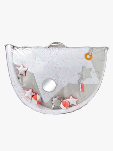 - Jouets d’éveil amovible. Sur le tapis : un miroir, un anneau de dentition, une étoile en coton avec papier crissant, une étoile vibrante et un nuage musical. Sur l’arche : 2 étoiles avec clochettes, 2 balles avec pouet-pouet et 1 hochet nuage